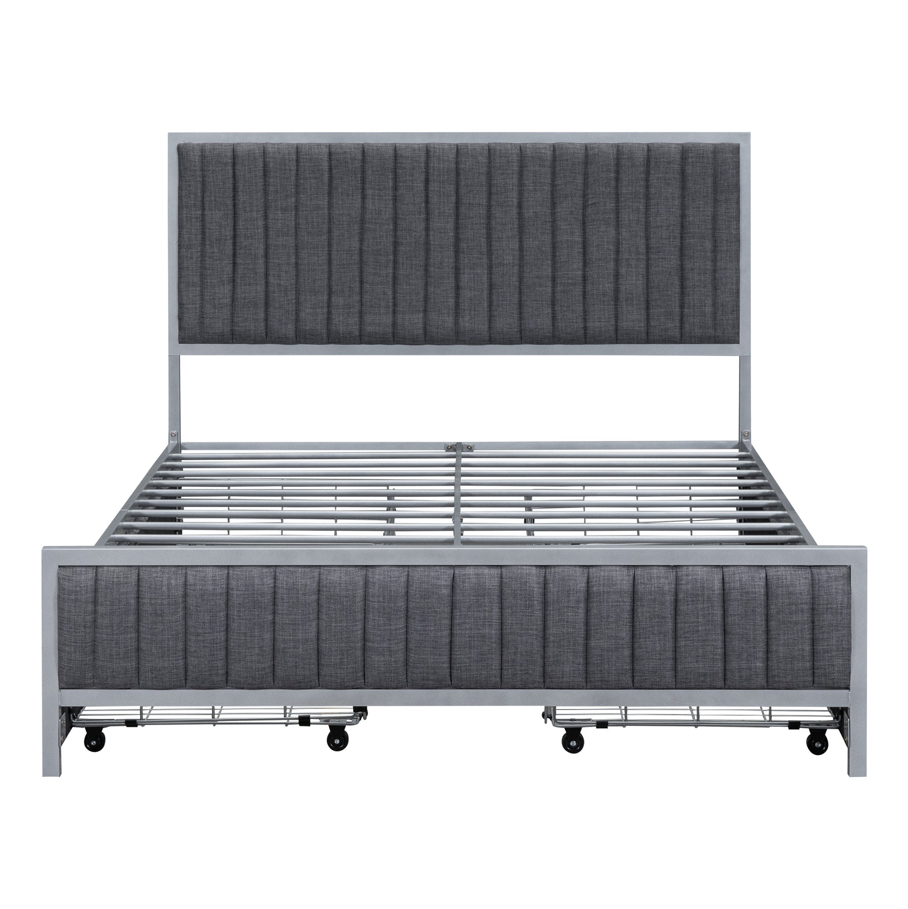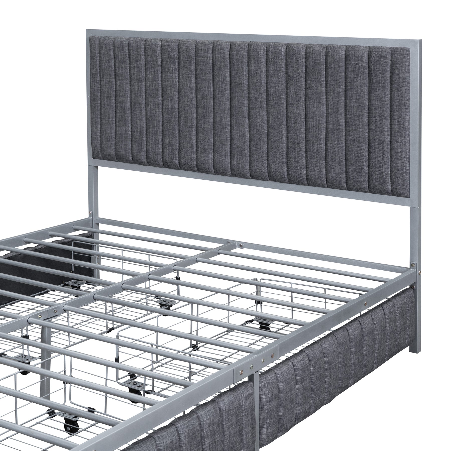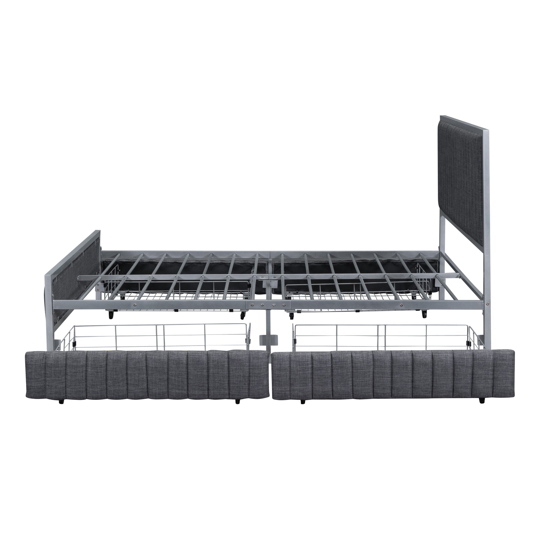 This beautiful metal frame upholstered platform Bed features upholstered headboard that adds a contemporary chic look to your bedroom and filled in thick foam to add extra comfort. Sturdy metal frame construction and a metal slat system to add extra stability and safety.And the 4 big drawers underneath the bed can easily be pulled in and out for maximum storage space, perfect for organizing anything from clothes and bed linens to toys and games.This beautiful Upholstered Platform Bed will certainly be a beautiful and practical piece in your bedroom.