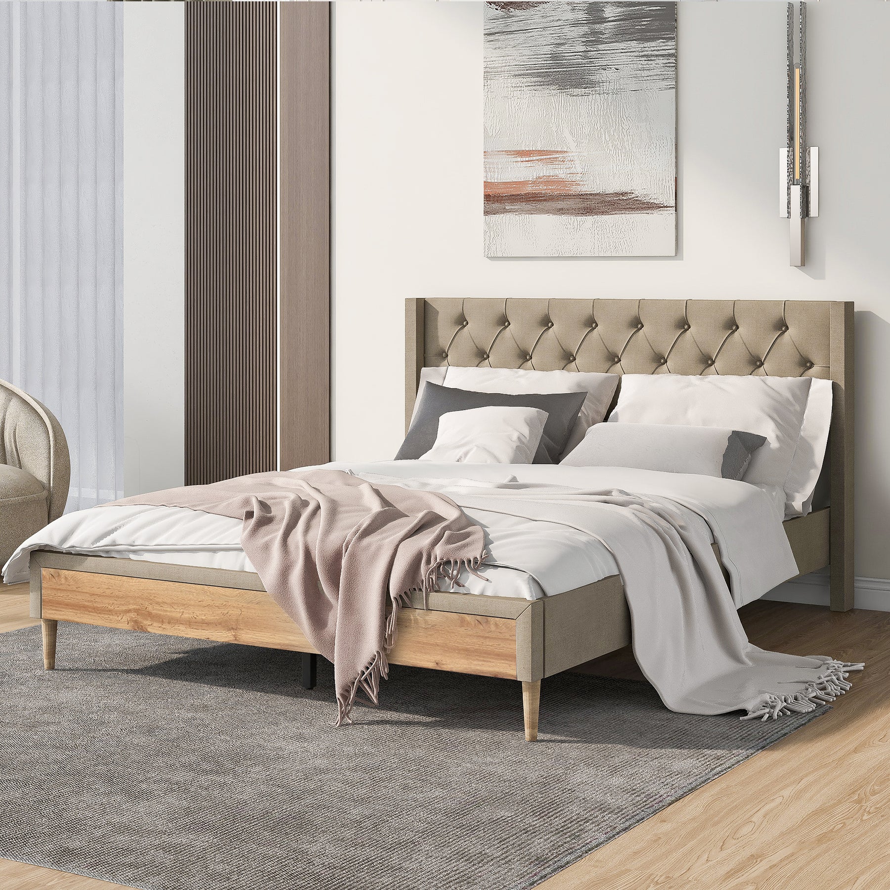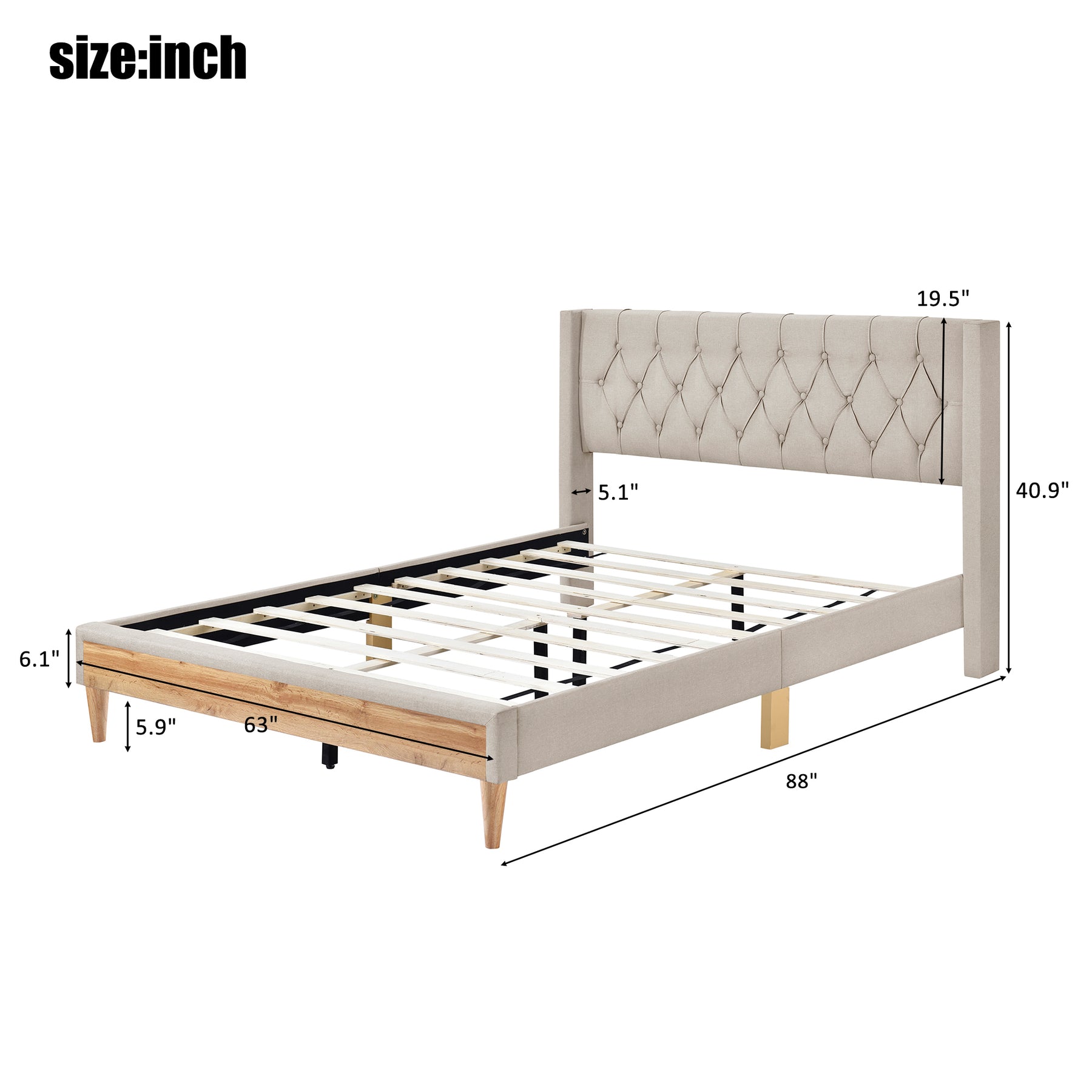 This beautiful Upholstered Platform Bed features button tufted upholstered headboard that adds a contemporary chic look to your bedroom and filled in thick foam to add extra comfort.Sturdy wood frame construction and the rubber wood legs to add extra stability and safety. Despite its size and solidity, this piece comes with hardware and instructions included and anyone can assemble it, without a problem.The combination of linen and wood grain surfaces is elegant and original.