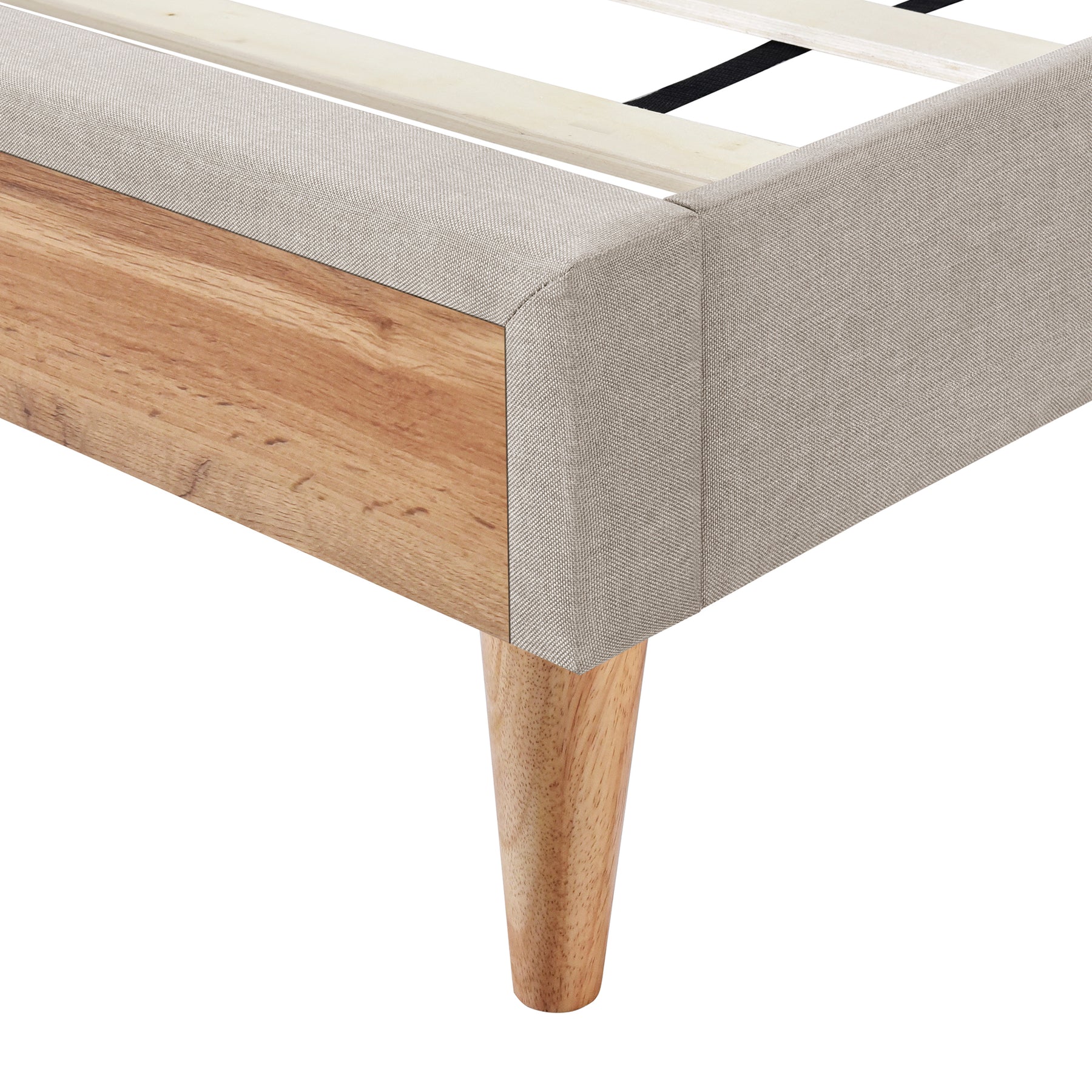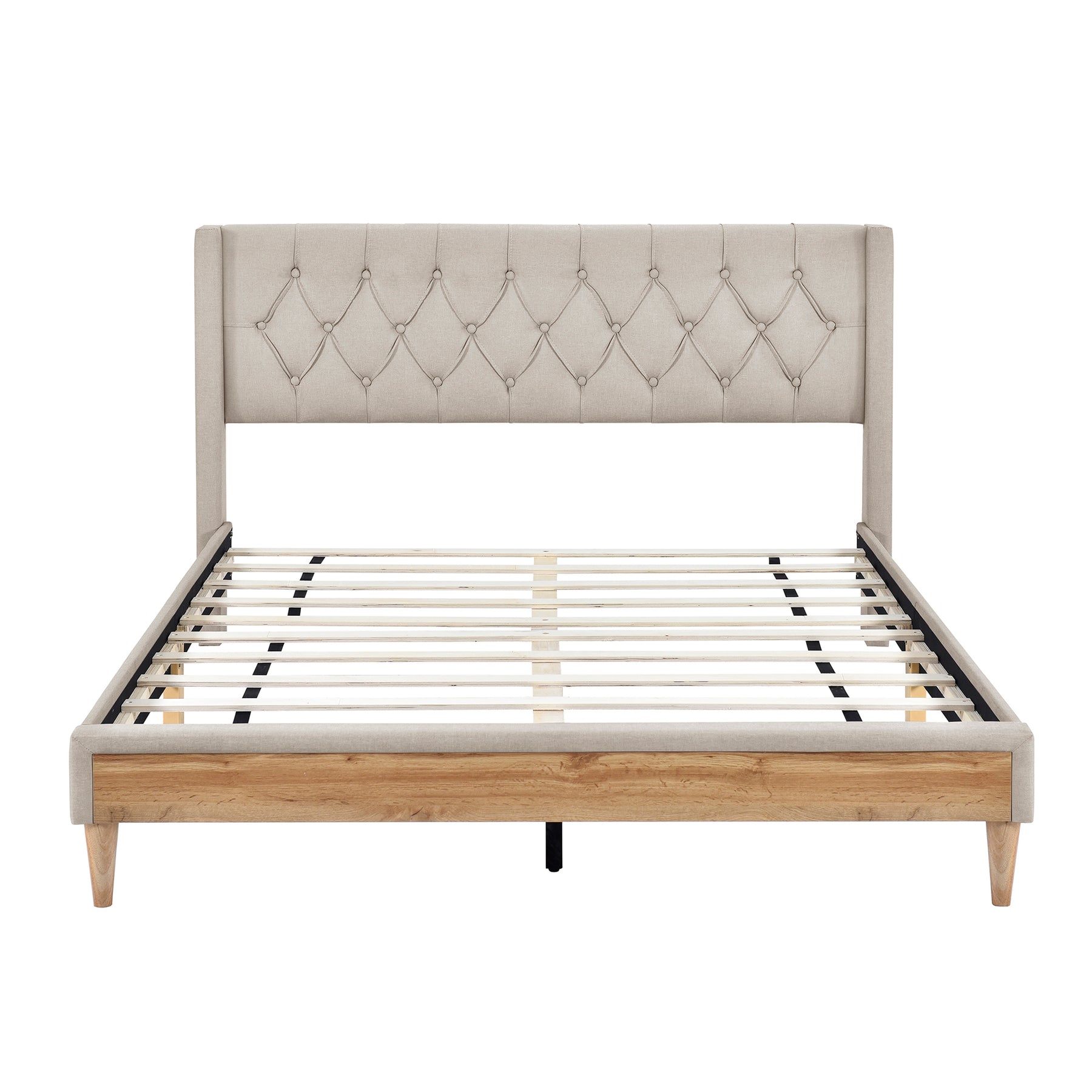Upholstered Platform Bed with Rubber Wood Legs,No Box Spring Needed, Linen Fabric,Queen Size-Beige