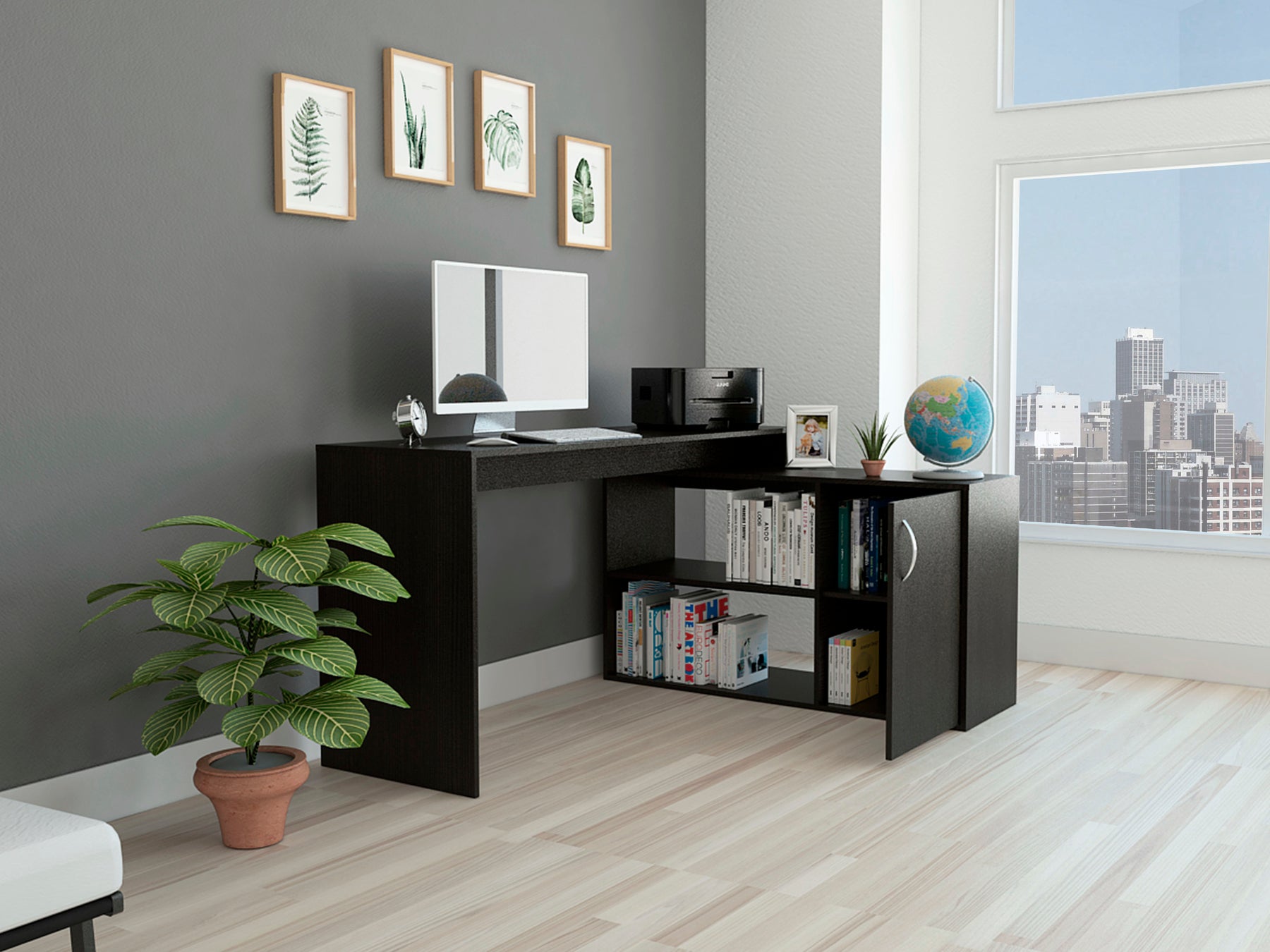 - Features two open shelves and one cabinet with two interior shelves for your files, books or decor