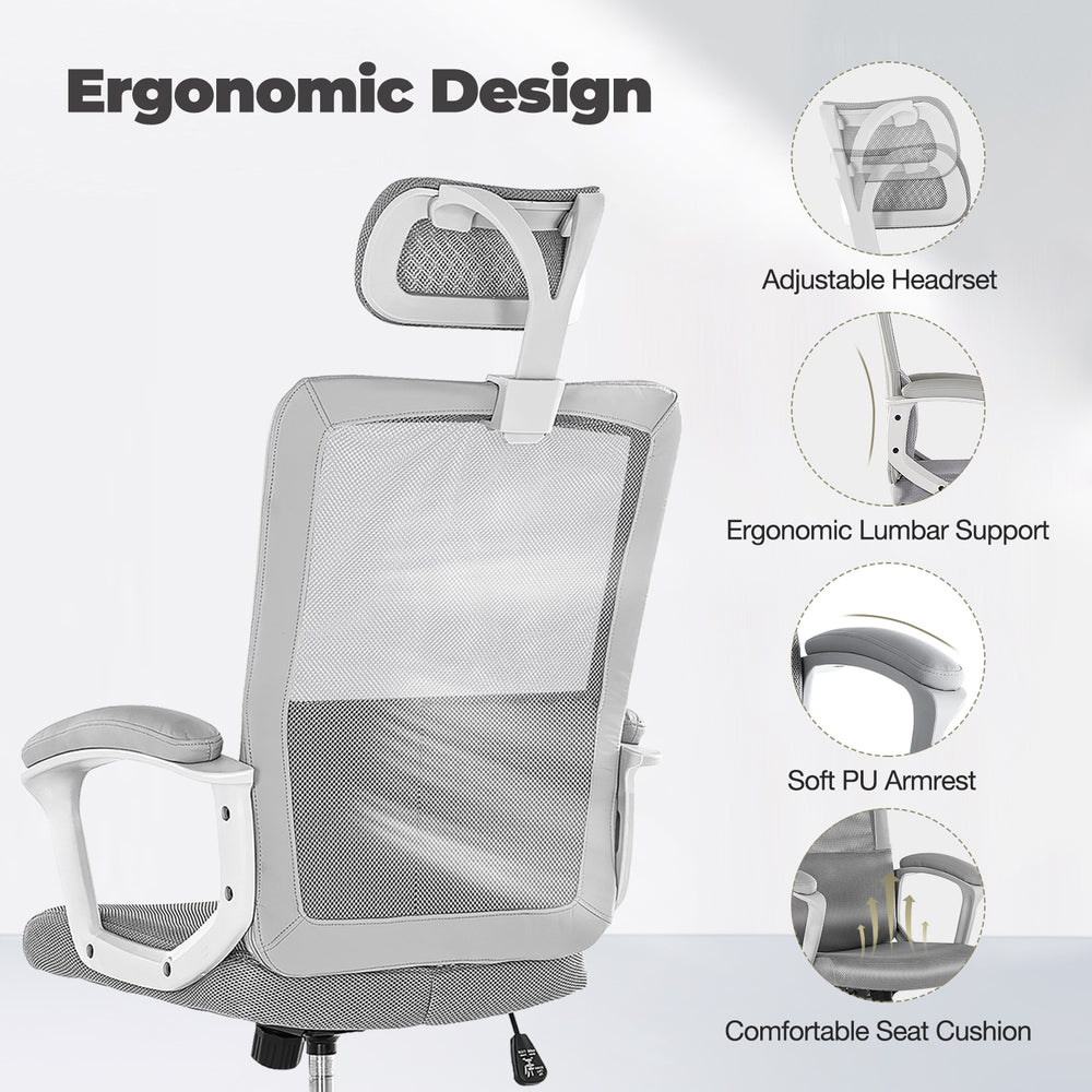GREY Ergonomic Mesh Office Chair, High Back - Adjustable Headrest with Flip-Up Arms