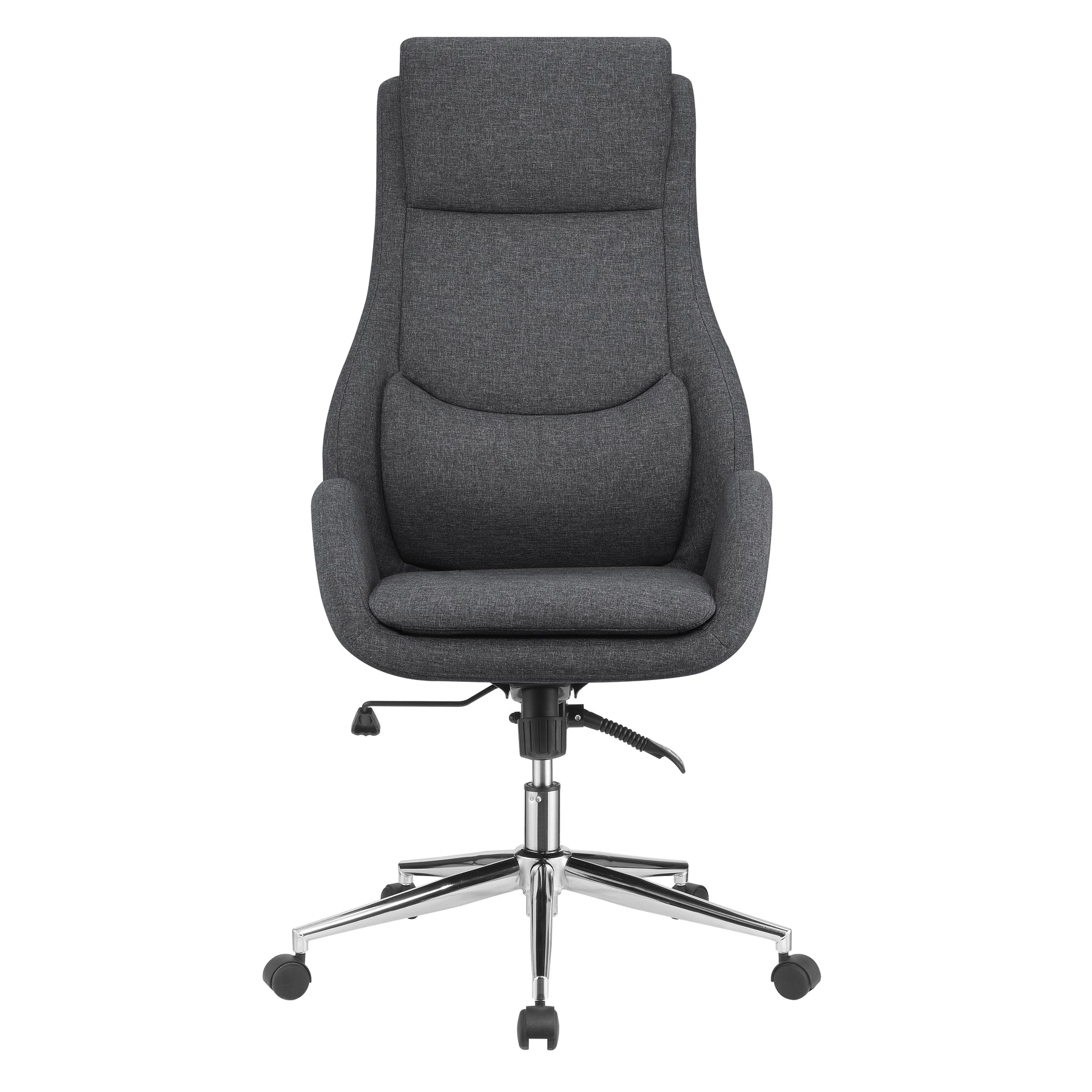 Improve productivity with a modern office chair that allows relaxation and comfort. This adjustable office chair features grey fabric upholstery with a chrome and black finish metal base, and a high back silhouette with mid-century modern-inspired rounded arm units