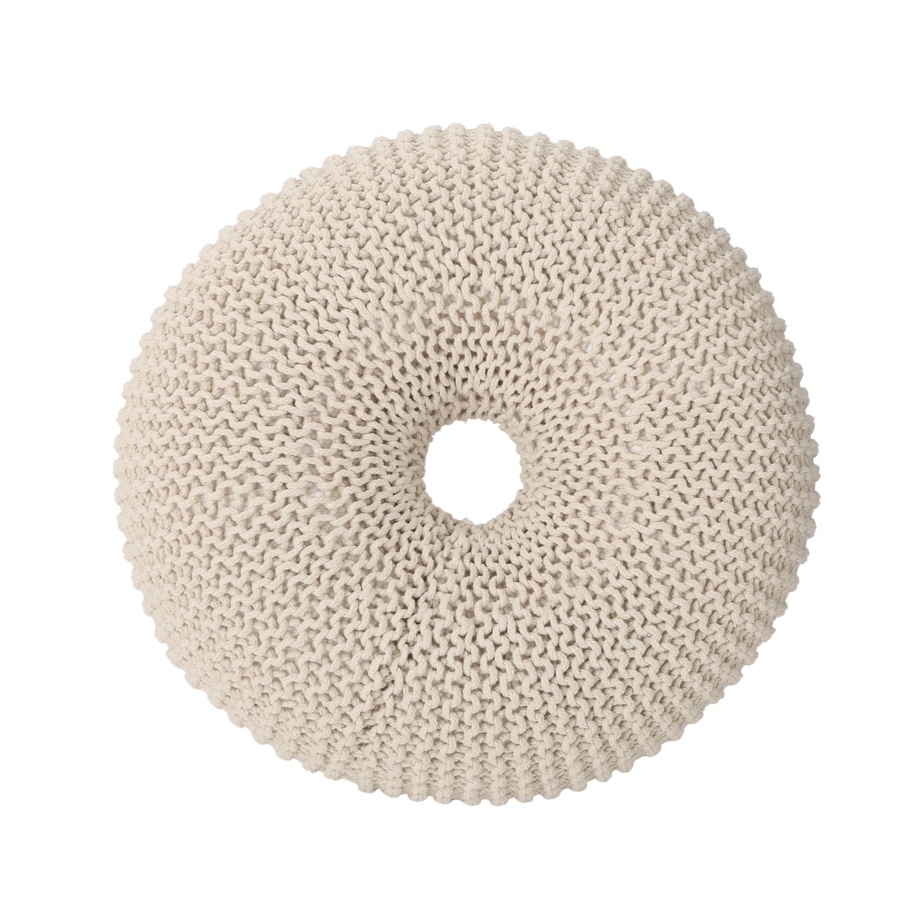 - Enjoy this cotton knitted donut pouf in any room of your home. Perfect for putting your feet up or using it as a small extra seat when company is over. Easy to store in a corner or by the bed when not in use, this pouf not only looks cute but is functional too.