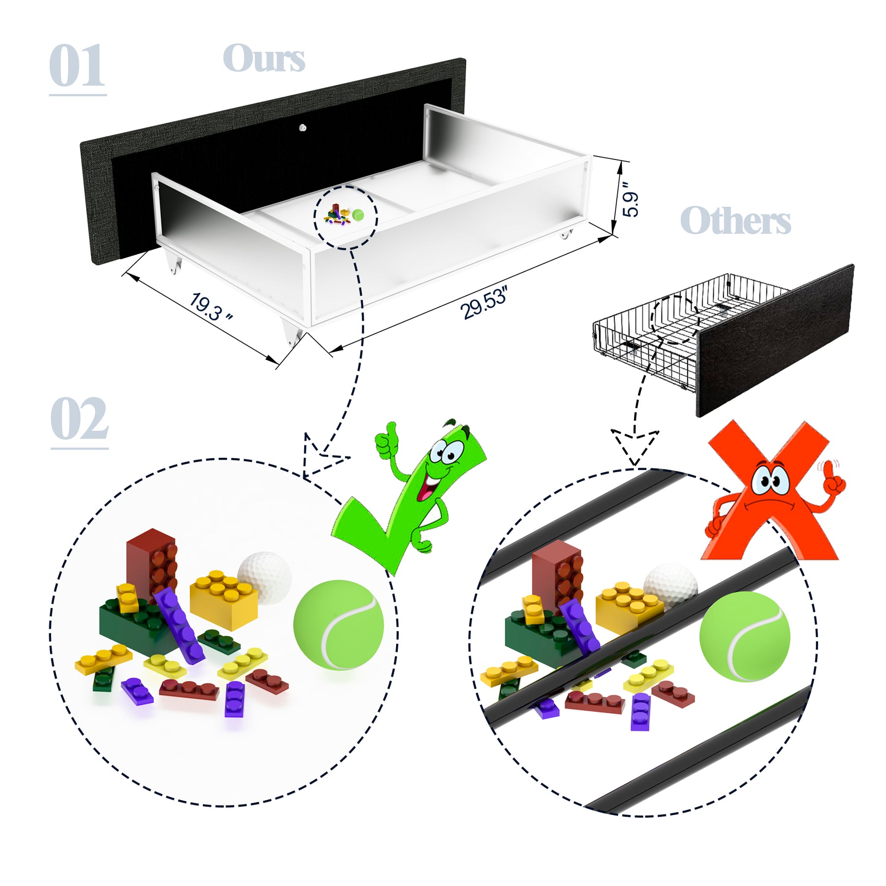 - [PATENTED DRAWER SYSTEM] Our utility patented drawer system boasts a resilient metal construction providing a 40LBS weight capacity per drawer. Drawer dimensions are 29.5" x 19.3" x 5.9", with a total of 4 under-the-bed drawers, 2 plastic-lined drawers on each side of the bed.