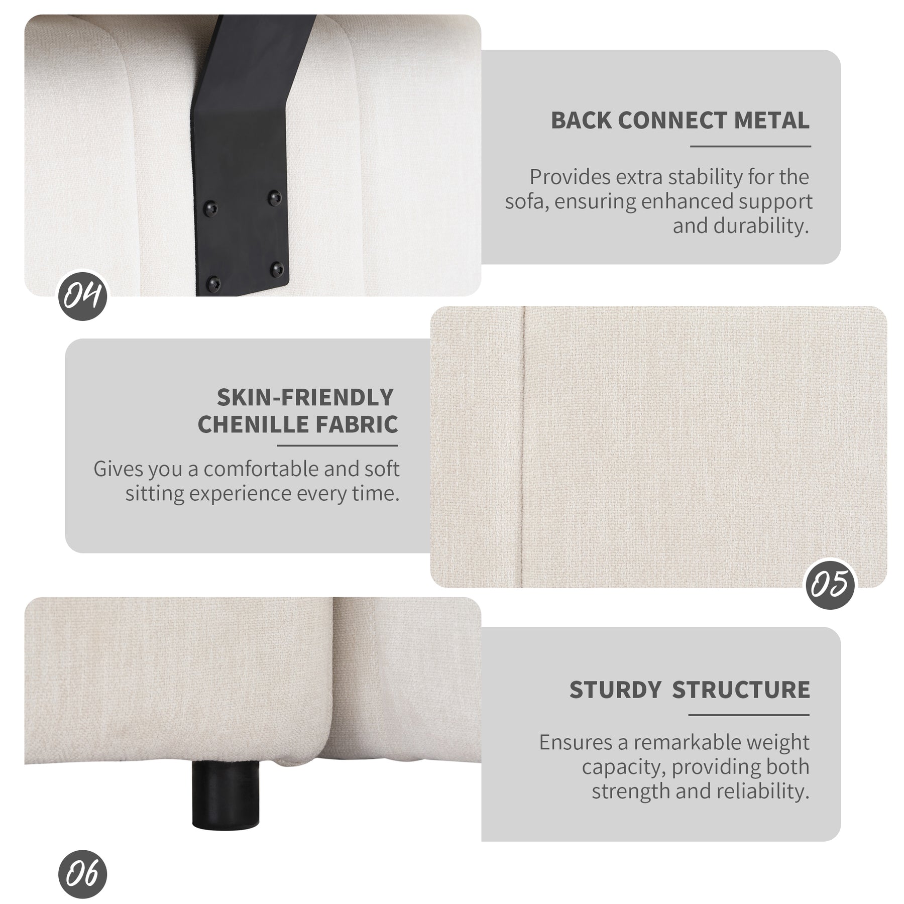 - Built to Last with Durable Materials - This sectional sofa is built to last, thanks to its durable construction and materials. The back connect metal behind the sofa provides stability and support, while the chenille fabric is designed to withstand everyday wear and tear. The sofa is also easy to clean, making it a great choice for families with kids or pets. You won't have to worry about your sofa falling apart after just a few uses. It's built to withstand years of use.