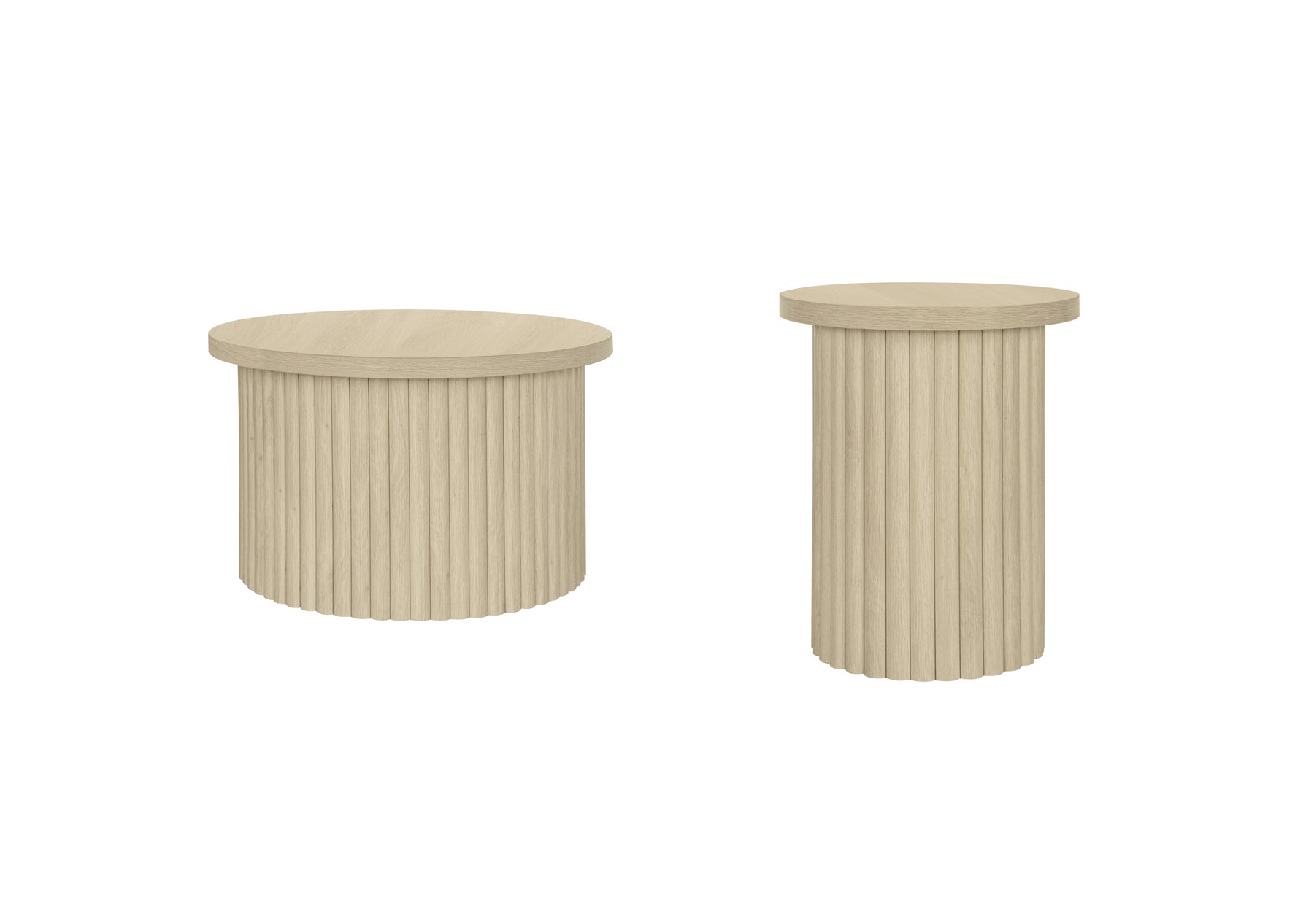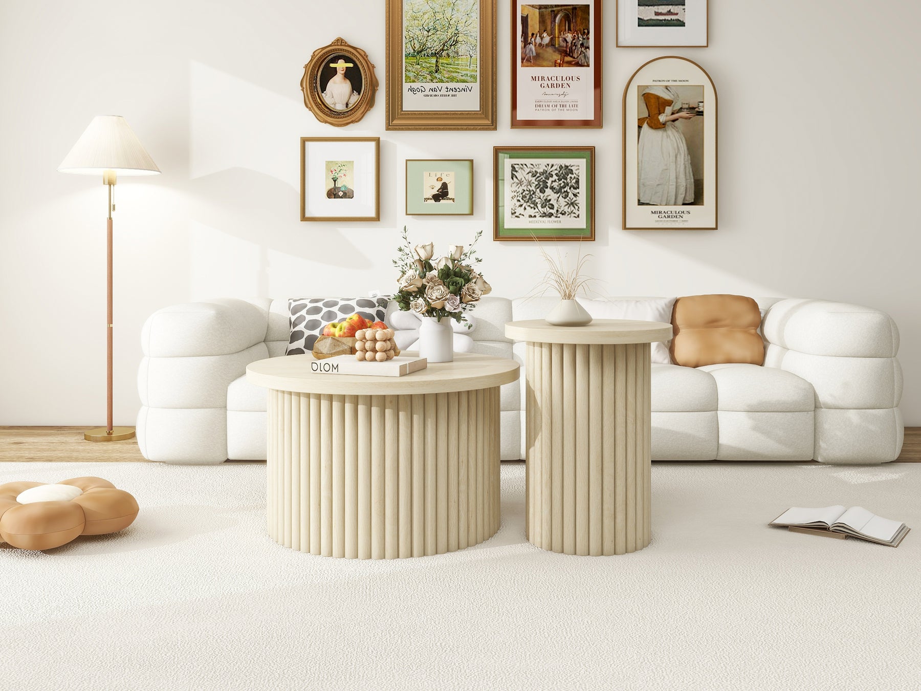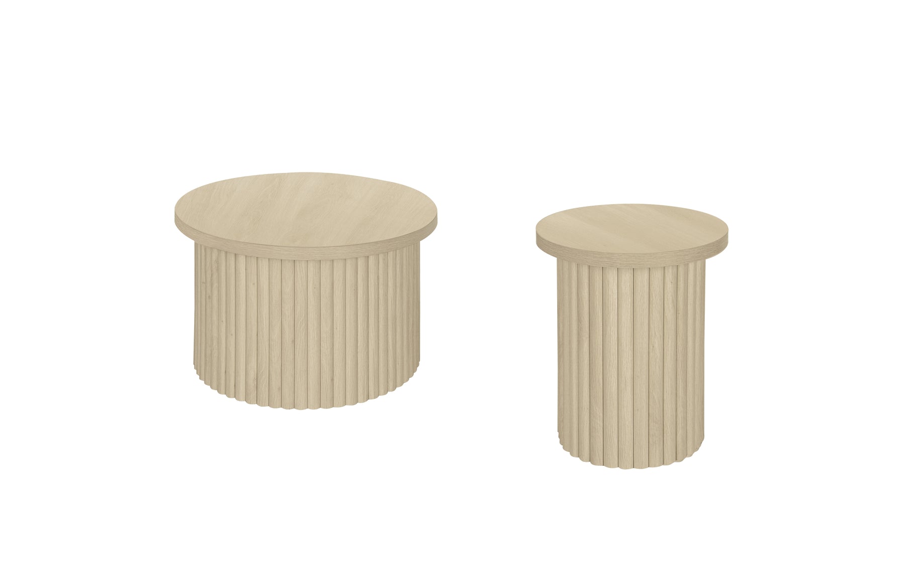 - Round set of two coffee tables, one large and one small, can be combined in a variety of ways, can be used side by side, can be used separately.