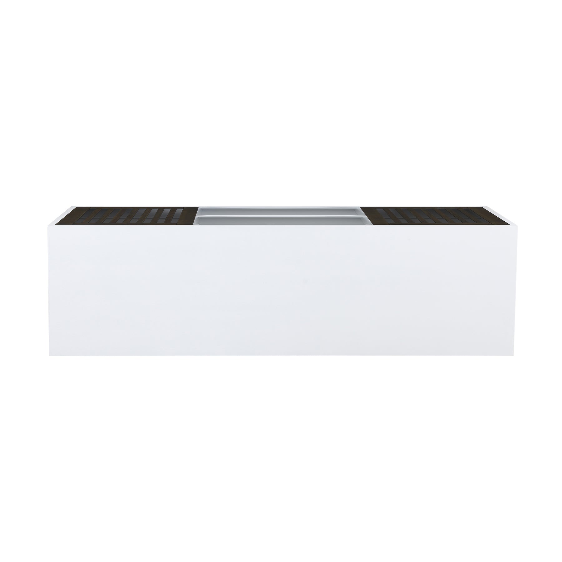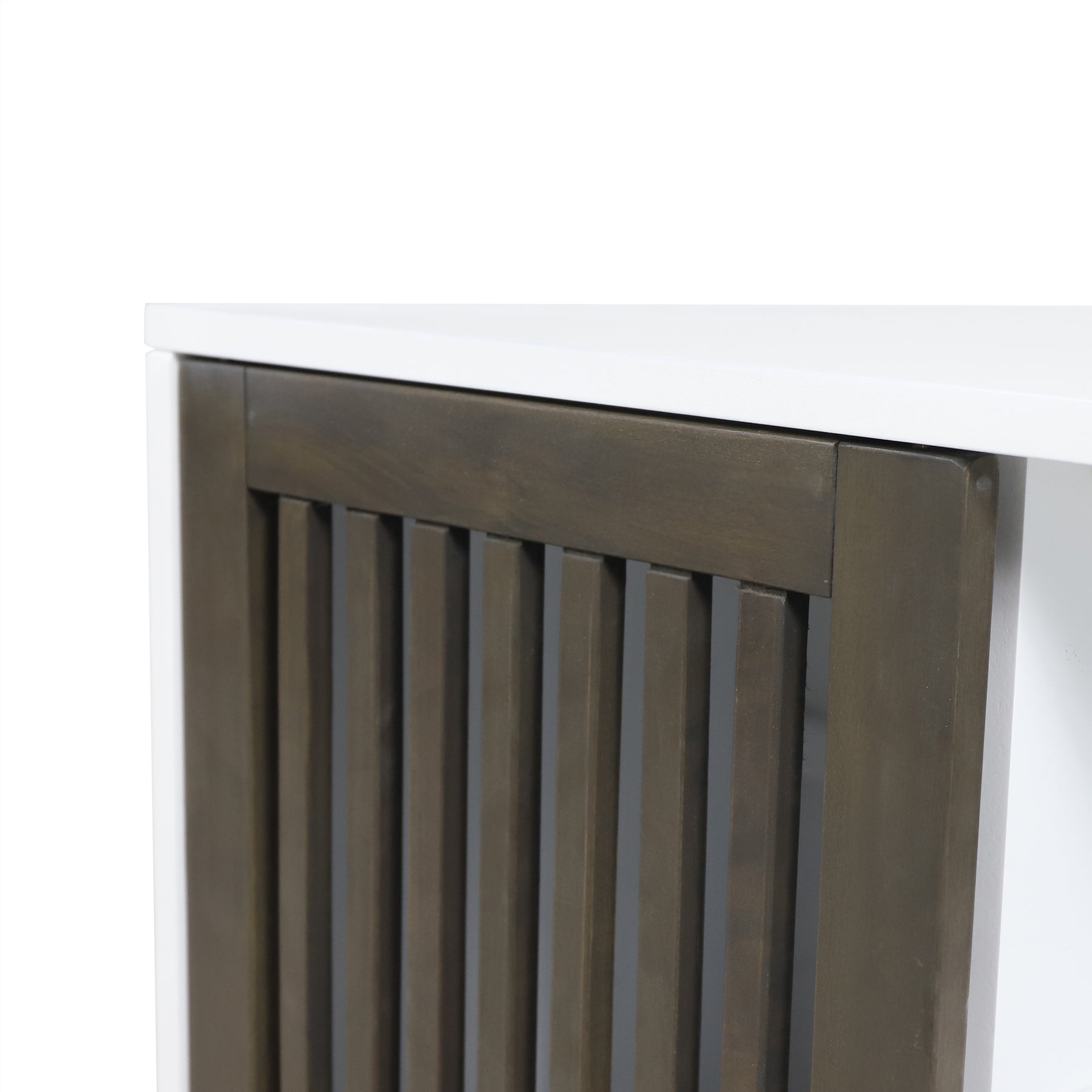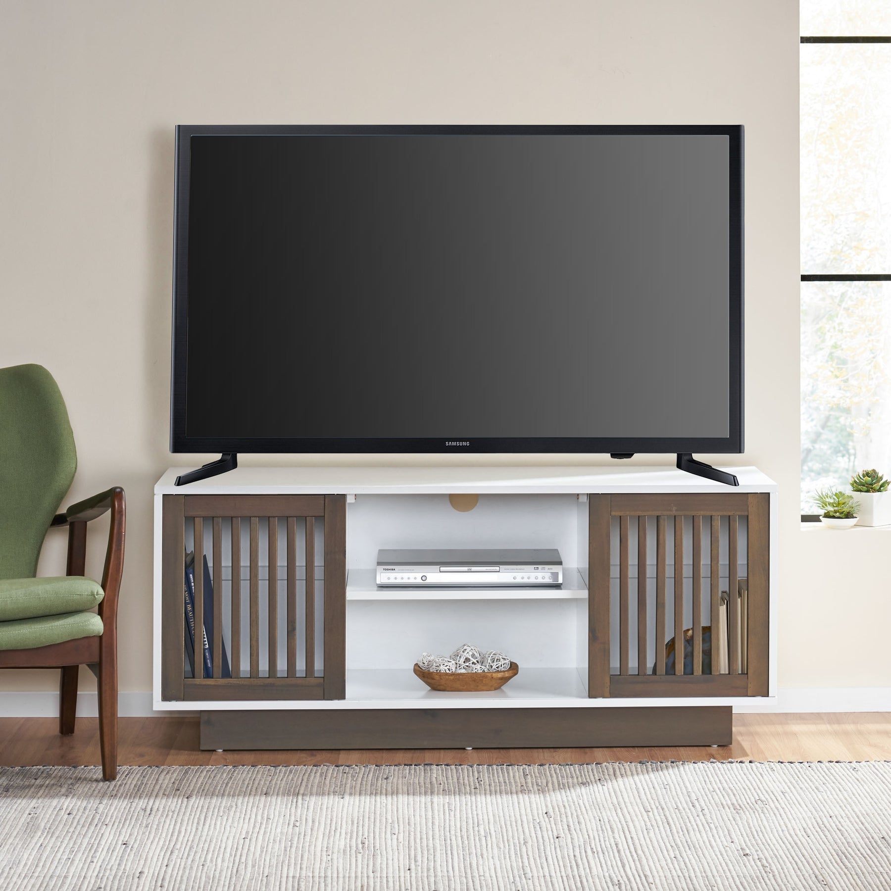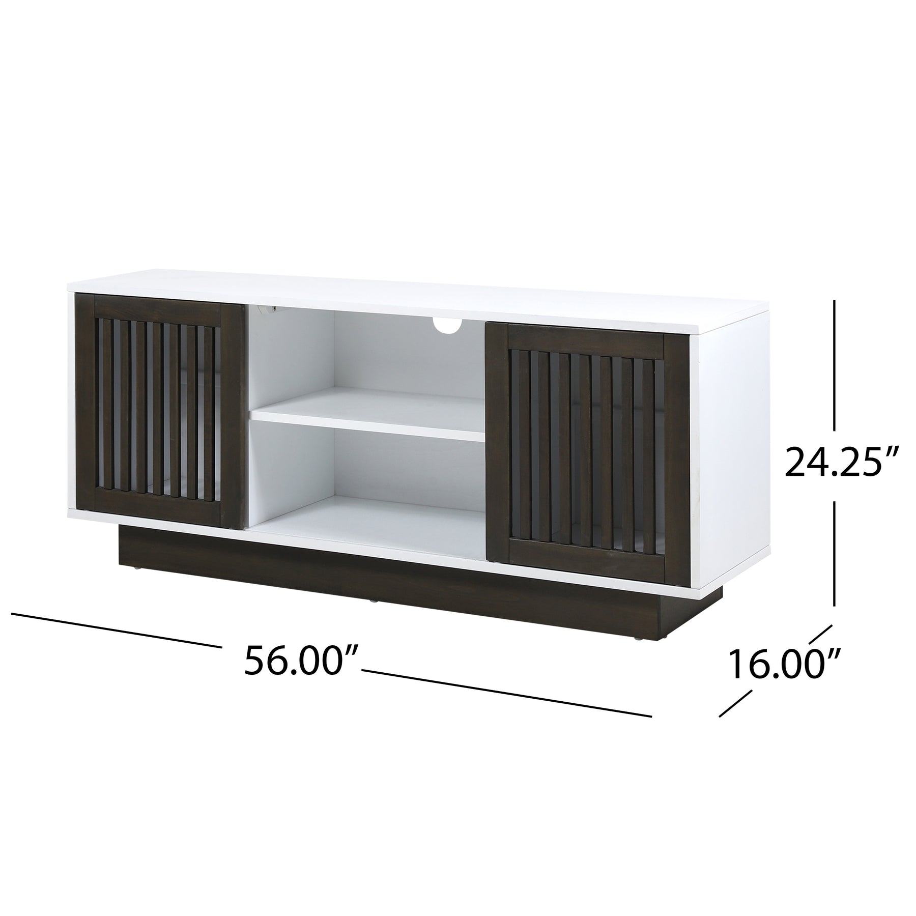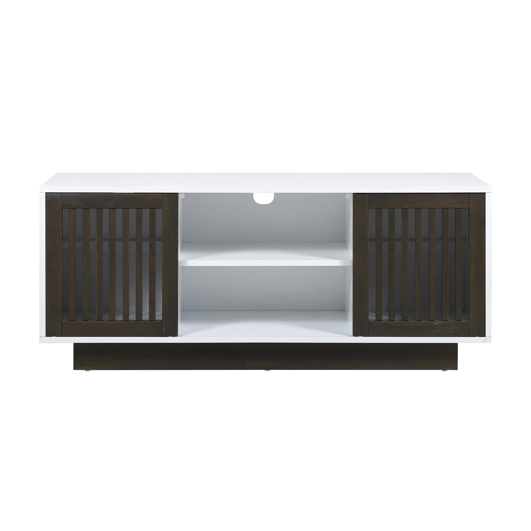 - Featuring a two-toned finish and stunning open slat panel doors, this stand brings together modern style and a mid-century design, making this piece ideal for any living room.