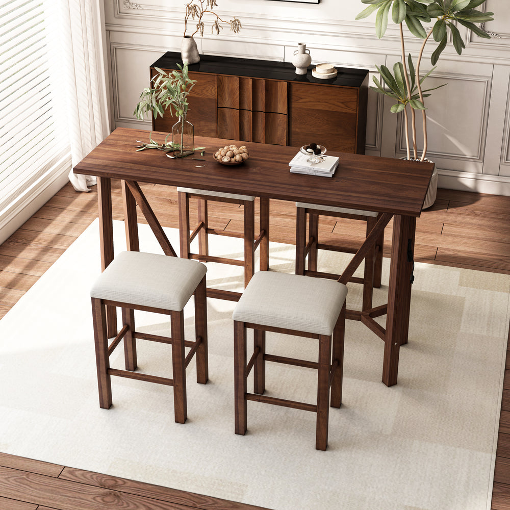 5-Piece Dining Table Set with Power Outlets,Bar Kitchen Table Set with Upholstered Stools, Easy Assemble, Walnut Table+Beige Stool